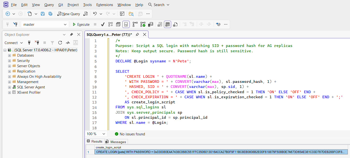 Purpose: Script a SQL login with matching SID + password hash for AG replicas