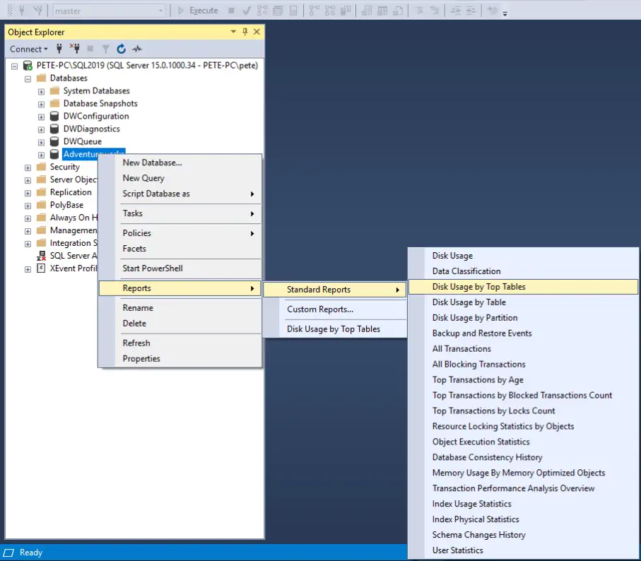 The Disk Usage by Top Tables report in SQL Server Management Studio is one of the quickest ways to see where space is being used inside a database.