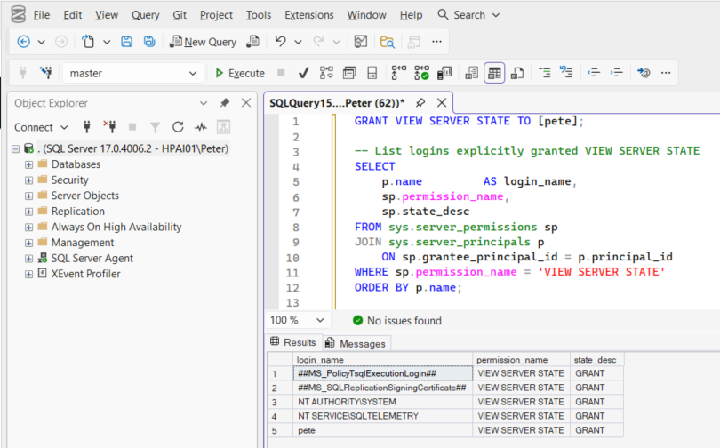 SSMS query window running GRANT VIEW SERVER STATE for a Login