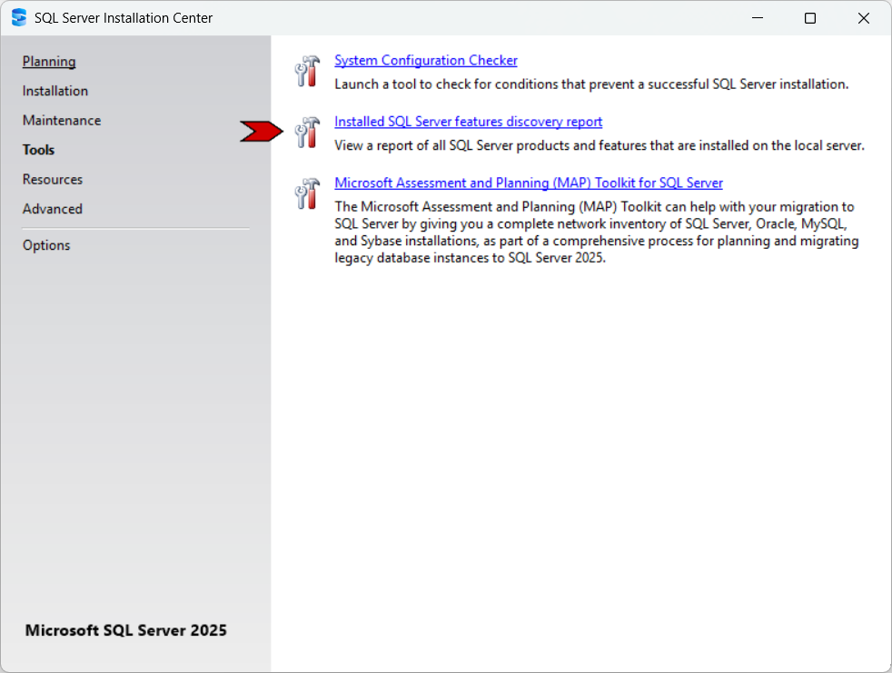 To run it, open the SQL Server Installation Center, go to Tools, and select Feature Discovery Report.