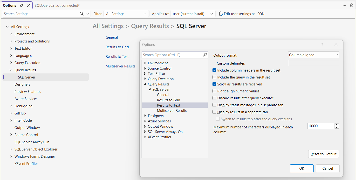 SSMS Results to Text output option