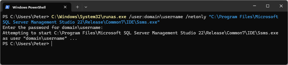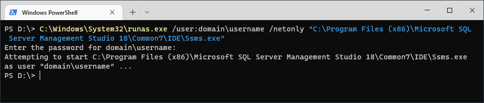 C:\Windows\System32\runas.exe /user:domain\username /netonly "C:\Program Files\Microsoft SQL Server Management Studio 22\Release\Common7\IDE\Ssms.exe"