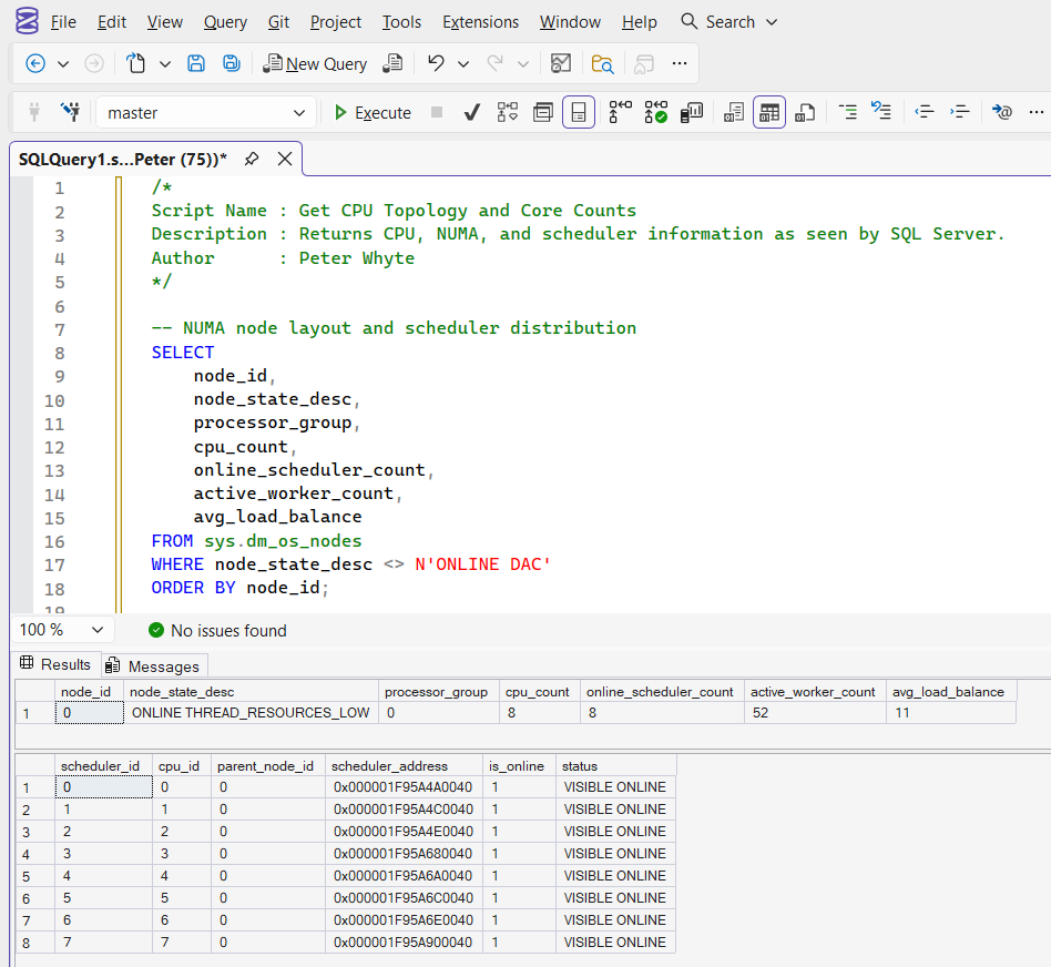 The first result set shows how CPUs are grouped into NUMA nodes and how many schedulers are available per node. The second result set provides scheduler-level detail, allowing you to confirm CPU distribution and online status.