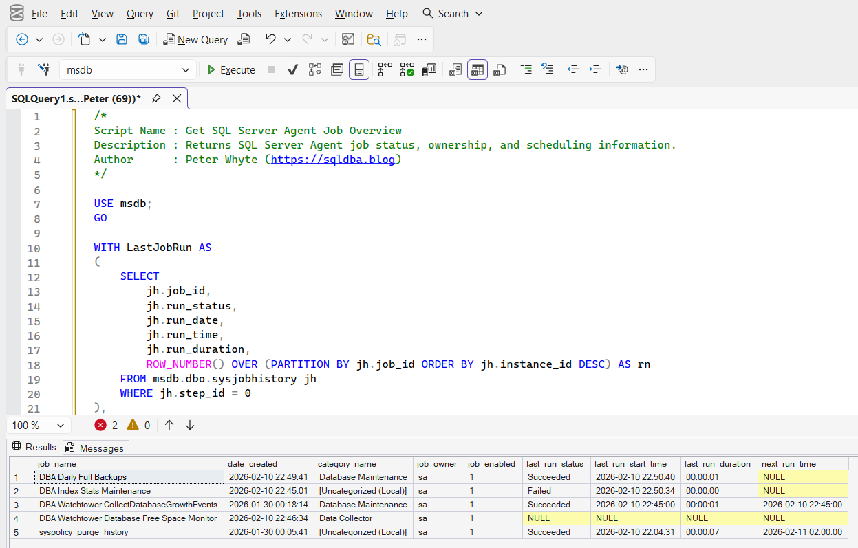 It’s a practical check when reviewing inherited environments, validating job ownership, identifying disabled jobs, or confirming schedules after changes or incidents.