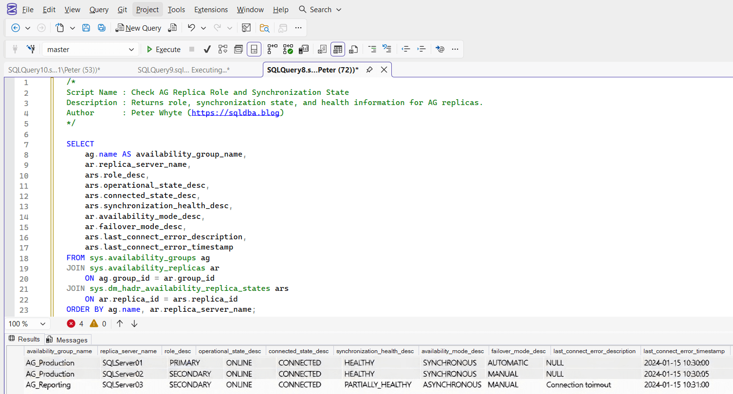 This script returns the current role, synchronization state, health status, and failover configuration for replicas participating in an Always On Availability Group.