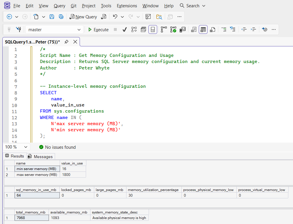This script shows how memory is configured for SQL Server and how much memory is currently being used. It helps confirm that instance-level memory settings are sensible and whether SQL Server or the host appears to be under memory pressure.