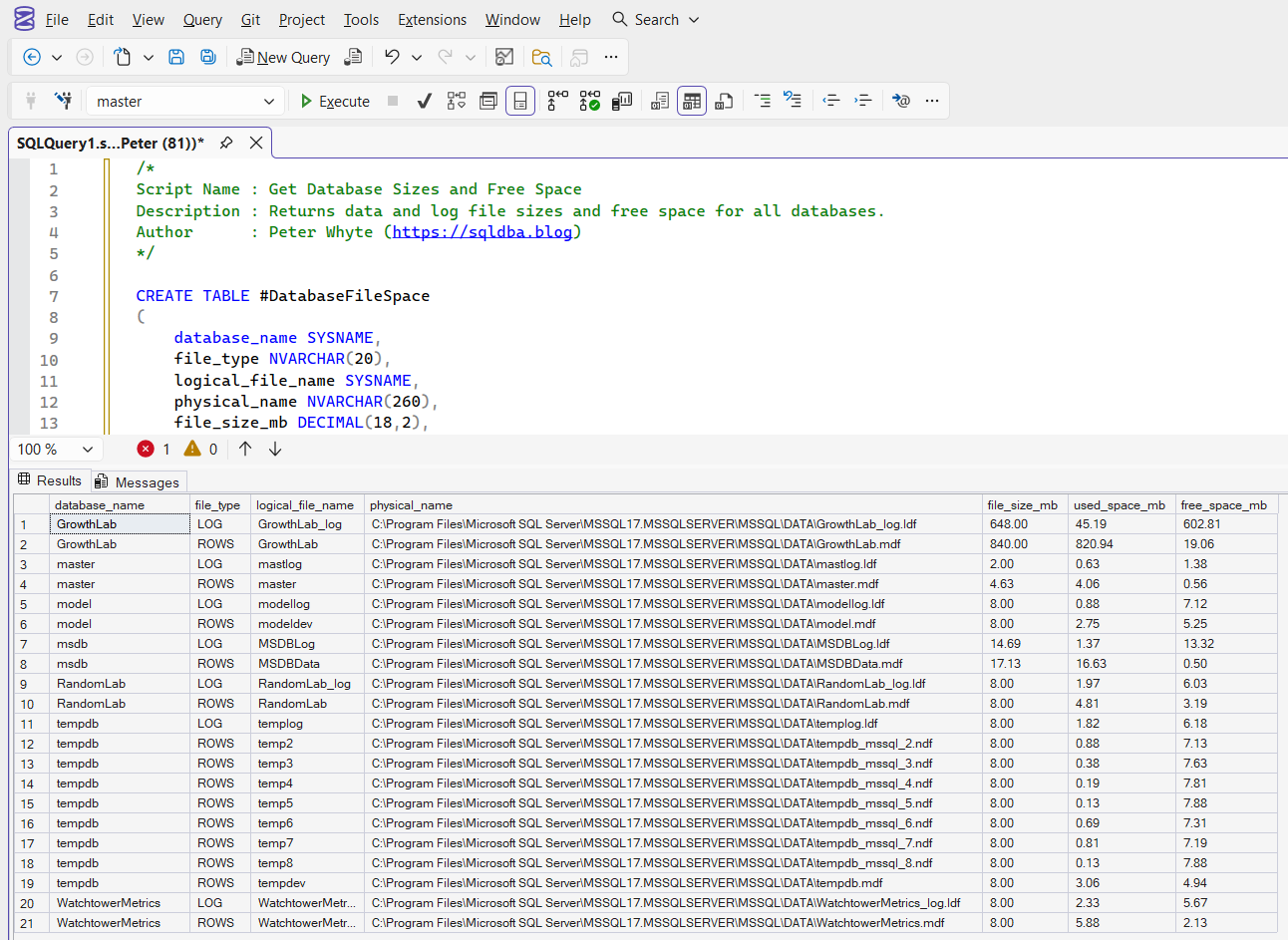 If you want a deeper explanation of how SQL Server calculates file usage and how to interpret the results in different scenarios, see Get Database Sizes and Free Space in SQL Server.